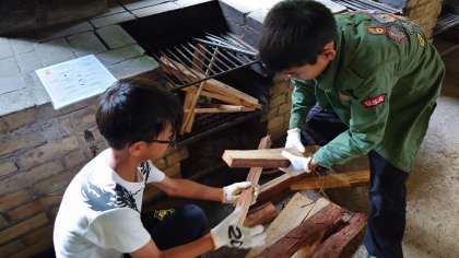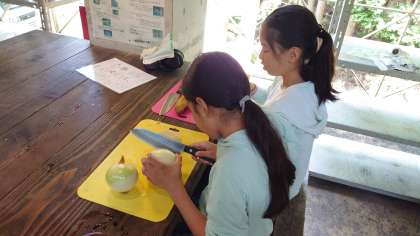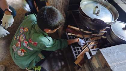 アスレチックで汗をかいたあとは、いよいよ自分たちでカレーライスを作る野外炊事です。調理の係と、かまどの係、仕事を分担しながら進めます。さあ、美味しいカレーライスは完成するでしょうか。