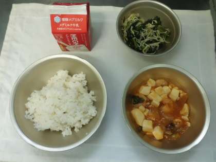 今日の給食は,麦ごはん・牛乳・えびと豆腐のケチャップ煮・ほうれん草ともやしのいためナムルで,中華風の献立でした。えび・しいたけの苦手な児童も結構いるのですが,最後まで頑張って食べました。