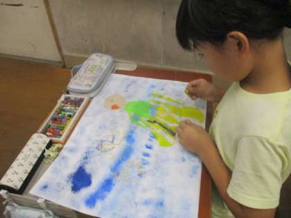 「トラといっしょに」という本の読み聞かせを聞き、お話の場面の絵をイメージして描きました。コンテや絵の具、パスなどの様々な画材を組み合わせて工夫しながら絵を仕上げることができました。どの絵もとても素敵です。