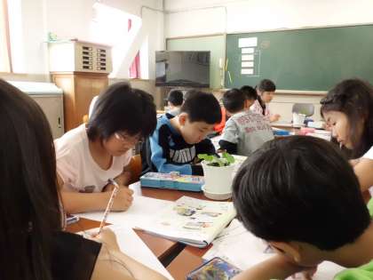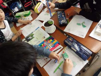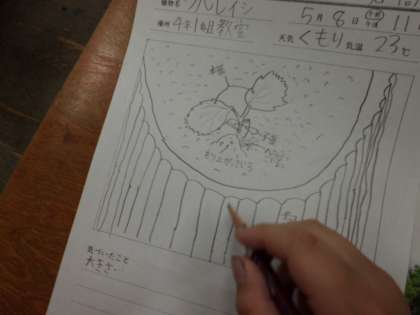 芽や葉の様子をじっくりと見て,観てワークシートに書き込んでいきました。
