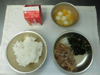 今日の給食は,ごはん・牛乳・豚肉とこんにゃくのいため煮・ほうれん草とじゃこのいためもの・フルーツ白玉でした。豚肉とこんにゃくのいため煮は,豚肉・糸こんにゃく・
