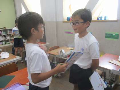 英語で友だちに何が好きかをたずねたり、自分の好きなものを伝えたりする学習をしています。What〜do you like?の言い方にもどんどん慣れてきて、友だちの好きなものもしっかり聞き取ることができるようになってきました。