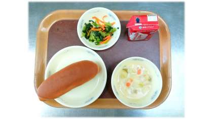 今日の給食は 黒糖コッペパン 牛乳 キャベツの米粉クリーム煮 小松菜のソテー です。