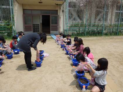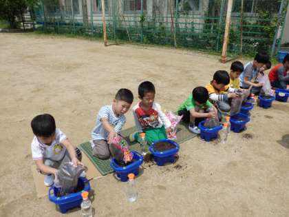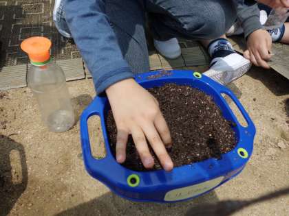 生活科の学習で,あさがおを育てます。一人ひとりのはちに,あさがおの種を植えました。土のおふとんは,ふかふかにしました。お水もたっぷりあげました。