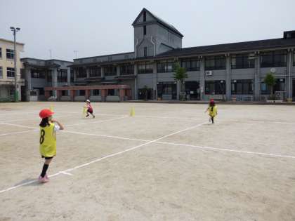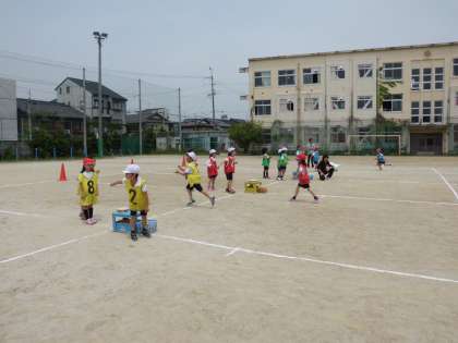 2年生の体育では「リレー」に挑戦しています。グループごとに作戦を立ててタイムを短くするようにがんばっています。