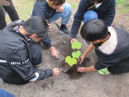 平和の世の中が続きますようにという願いをこめて6年生みんなで植樹しました。