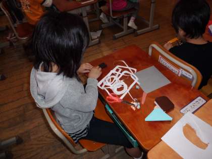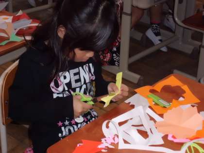 図工で,はさみをつかって,いろいろな形に切りました。くるくるくる,切り落とさないようにはさみを上手に使って切ったり,花の形に切ったり,模様を作ったり・・・・