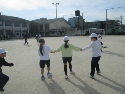 手をつないで増えおにをしました。3人で走る方向を合わせるのが難しかったですね。寒くなってきましたが、たくさん走って温まりました。