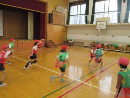 体育科「陣取りゲーム」は中盤を迎え、初めは難しいルールに悪戦苦闘している様子でしたが、段々とタグラグビーらしい動きができるようになってきています。初めはタグをとれても大きな声で「タグ!」と言うのを忘れている子も多かったですが、最近はタグをとれていないのに、取ったと思って叫んでしまう人がいるほどです。それほどやる気が溢れているんですね。