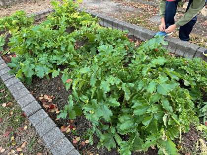 寒さが厳しくなってきました。そんな中、葉の下の大根が太くたくましく育ってきています。まだまだ、立派な大根に育ってほしいと願いを込めてこれからも水やりを頑張っていきます。
