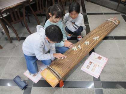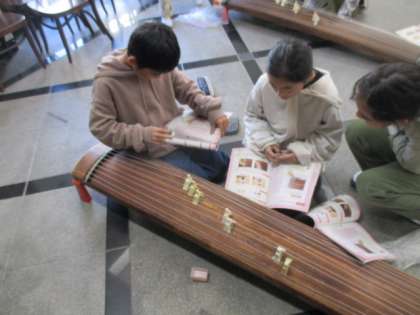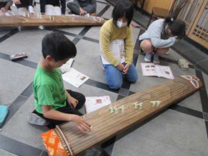 学習発表会でも披露した「琴」。今日はみんなで演奏してみました。学習発表会で演奏を担当した人を中心にどうやって弾くのか、どの弦を弾くのか、いろいろと試しながら演奏してみました。