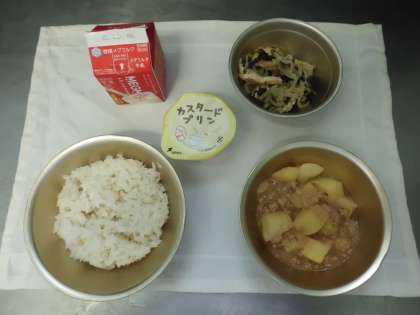 今日の給食は,麦ごはん・牛乳・じゃがいものそぼろ煮・切干し大根の煮つけ・プリンでした。切干し大根には小松菜が入っていました。彩りもよく,ごはんにもよくあいました。冷たいデザートもうれしかったです。