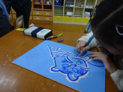 彫刻刀を使って、もくもくと彫り進めています。