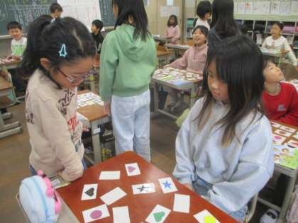 お店やさんとお客さんに分かれて、”What do you want?"”a blue triangle,please."とお互いに伝え合っています。どんなカードになるでしょうか。楽しみですね。
