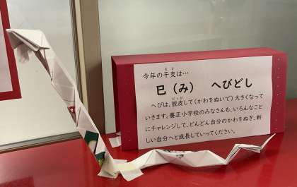 (写真は、校長室前に飾った干支の折り紙、にこにこ集会で活躍した児童会代表、そして先月のにこにこ学習の感想を言ってくれている様子の写真です。)