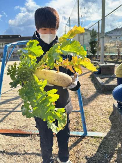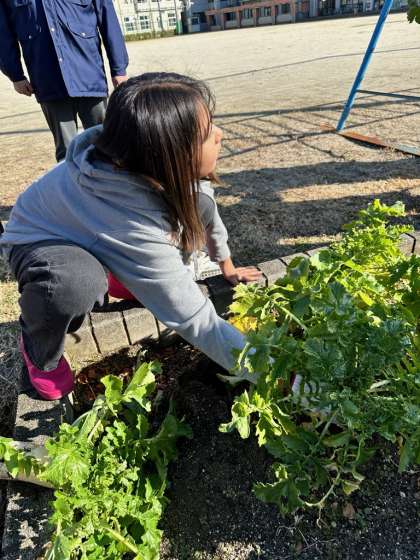 今日は、9月に種をまき、愛情をこめて大切に育ててきた大根の収穫を行いました。猛暑の影響や日当たりの影響などもあり、収穫した大根の大きさは様々でしたが、中にはとても大きな大根もあり、子どもたちからは驚きと喜びの歓声があがっていました。今回の大根栽培を通して、子どもたちの中には様々な気付きが生まれたり、学びがあったりしたことと思います。