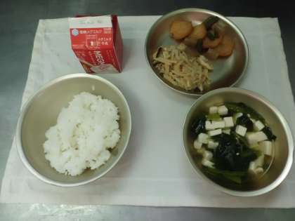 今日の給食は,たけのこごはん・牛乳・平天の煮つけ・すまし汁でした。パンのお皿に盛りつけたたけのこごはんの具を各自でごはんにまぜて食べました。とうふとほうれん草のあっさりとしたすまし汁と,たけのこごはんとよくあいました。