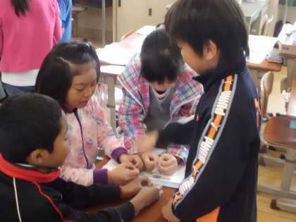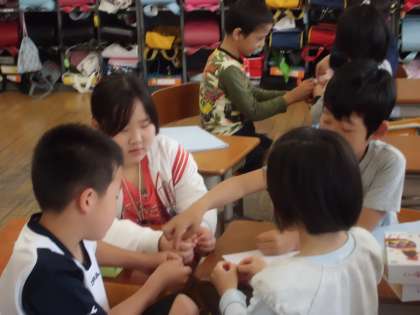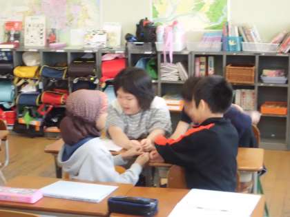 朝の音読で『ちゃつぼ』を読みました。母音をはっきり発声した後,ちゃつぼあそびをしました。グループで手をちゃつぼにみたてて,楽しく手あそびをしました。はやさをかえたり,ちゃつぼにゆびをいれるじゅんばんをかえたりくふうしてあそぶことができました。