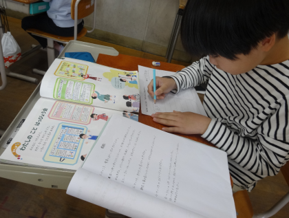 2年生は、家の人にインタビューしたことを元に、巻物を作っています。
