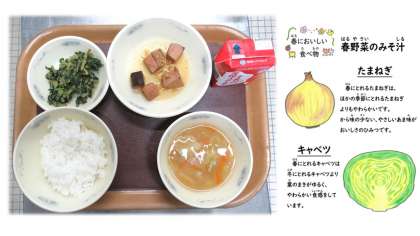 春野菜のみそ汁には、春が旬の野菜がたくさん入っています。スーパーでも新玉ねぎ、春キャベツ、新じゃがいもといった春野菜が並んでいますね。具だくさんの汁物をおいしくいただきました。