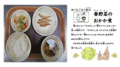 今日の給食は、3月の和(なごみ)献立の日で、 ごはん わかさぎのこはくあげ 春野菜のおかか煮 みつばのみそ汁 です。
