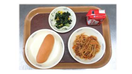 今日の給食は 小型コッペパン 牛乳 スパゲティのミートソース煮 ほうれん草のソテー です。1年生の入学をお祝いした行事献立です。