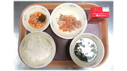 今日の給食は ごはん 牛乳 豚肉のしょうがいため 五目煮豆 とうふの吉野汁 です。