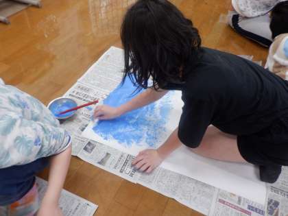 えのき学級の学級目標をのせる気球の色をぬりました。ビニール袋の両端を結んで、ポンポンみたいにして色をぬっていきました。楽しんで取り組むことができました。