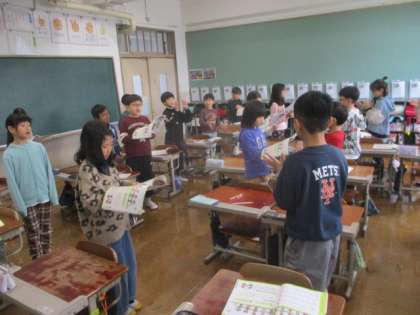 今日は、4年生になって初めての音楽の学習を行いました。子どもたちにとってもなじみのある「小さな世界」という歌を聞いたり、歌ったりしました。学習の中盤からは、手拍子や足踏みを交えながら体全体で歌の素晴らしさを感じながら、みんなで楽しく歌いました。笑顔いっぱい、元気いっぱいの素敵な時間でした。
