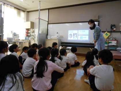 今日は身体測定を行いました。まずは「すいみん」についての話を聞きました。寝ている間の体の様子を学び、子どもたちは「今日からいっぱい寝よう」と、すいみんの大切さを感じていました。