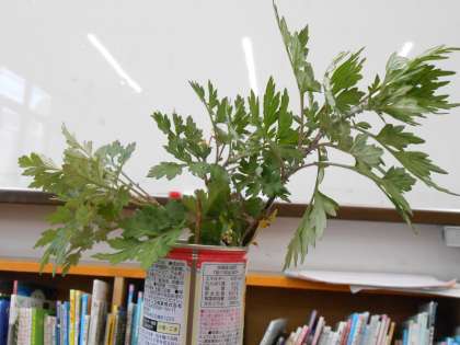 図書の時間には、本の貸出だけでなく、読み聞かせがあります。今日は「よもぎだんご」というお話を聞きました。子どもたちは、ばばばあちゃんのよもぎだんごの作り方に興味深々でした。よもぎを実際に見て、「これがよもぎか!」「作ってみたい!」と言っていました。校庭でよもぎを探してみましょう!