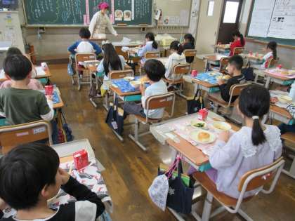 今日の給食は バターうずまきパン 牛乳 ポークビーンズ 小松菜のソテー 型チーズ です。