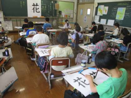 書写の毛筆の学習で「花」を書きました。始筆の入れ方や穂先の向きを意識したり、はらいの時の筆圧を意識したりしながら書きました。一画にこだわって書く姿はさすが4年生の子どもたち。高い集中力をもって、一人ひとりがそれぞれの「花」を書くことができていました。