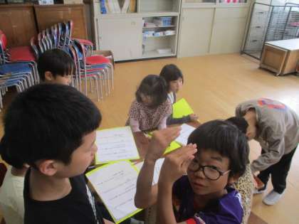 来週に迫った音読発表会の練習が、本格的に始まりました。今日は、全校音読の「ごじゅうおん」や各グループに分かれての詩のグループ練習に取り組みました。ただ読むだけではなく、「どんな工夫ができるのか!?」ということを各グループが一生懸命考えて、意見を出し合っていました。工夫を考え、意見を交わしている時の子どもたちは、とても楽しそうでした。与えられたものだけに取り組むのではなく、自分たちで考え、試行錯誤していくことで、どんどんと自分のものにして、その後の練習に取り組んでいくことができていました。