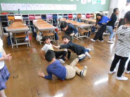 2年生は劇団衛星さんに来ていただき、演劇の学習をしました。今回は出されたお題に合わせて体で表現しました。子どもたちは「入学式」というお題に対して。花道を作ったり、ランドセルを背負った子を演じたり、桜の木になったりと、自由に表現しました。最初は緊張している様子でしたが、だんだんと楽しそうな笑顔が増えていきました。次回はついに演劇を実際にする予定です。楽しみですね。
