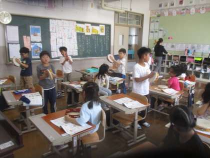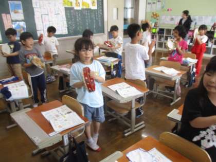 リズム打ちが上手な1年生!タンブリンを使って上手に演奏できましたね。