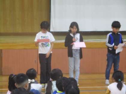 今日は、6月のにこにこ学習がありました。集会の初めには、5月のにこにこ学習のふり返りの発表がありました。4年生は、5月のにこにこ学習できまりを守ることの大切さについて考えていたのですが、代表児童の2名が、その学習を通して考えたことや感じたことについて堂々と発表することができました。