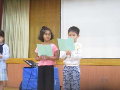 にこにこ集会では、先月のにこにこ学習のふり返りを代表の人が発表します。