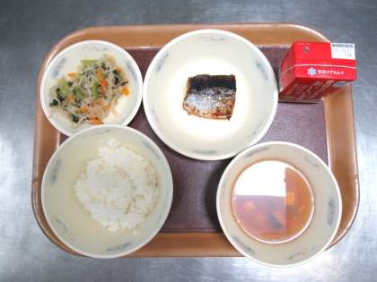 今日の給食は ごはん 牛乳 さわらの幽庵焼き 小松菜と切干大根の煮びたし みょうがのみそ汁 で、6月の和献立です。