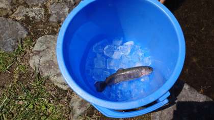 渓流魚であるイワナを、手でつかみます。川から流れてきた水はとても冷たく気持ちよさそうです。