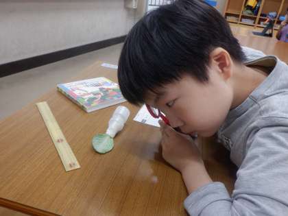 モンシロチョウの幼虫を観察しました。5mmくらいの大きさになっていました。虫眼鏡を使って観察し、色や形についてくわしくかけました!