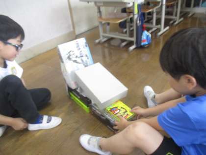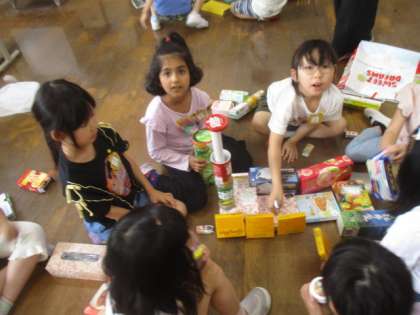 今日はお家から持ってきた箱を使って、積み上げたりつなげたりして、動物や乗り物を作りました。どれだけ高く積み上げられるか試してみるグループもありました。みんな友だちと協力して、とっても上手に作ることができました。たくさん空き箱を集めていただいたおかげで活動が充実しています。ご協力ありがとうございます。