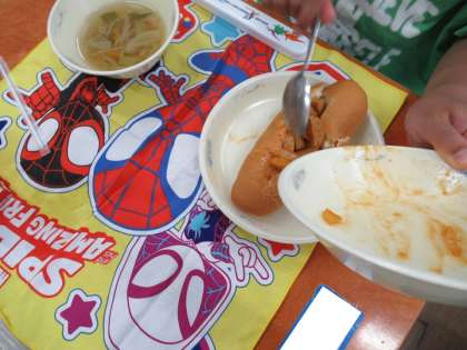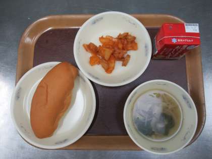 今日の給食は コッペパン(国内産小麦100%) ソーセージとポテトのケチャップサンドの具 スープ です。