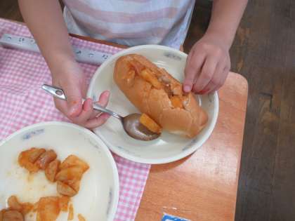 ソーセージ・じゃがいも・たまねぎにケチャップがよくからまった具を、自分ではさんで食べました。