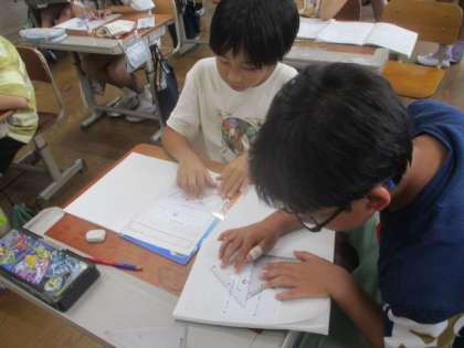 今日の算数は、「あれ」を使って垂直や平行な直線のかき方を考える学習を行いました。学習の初めに、どのように「あれ」を使えば垂直や平行な直線をかくことができるのかを考える時間をとりました。この時間で大切なことは、「正解が見つからなくてもいいから、考えることだ」という話をしてから活動に入りました。すると、子どもたちは、「あれ」を使って試行錯誤を繰り返しながら一生懸命思考を働かせていました。一人で、考えている子もいれば、友達と一緒に考えている子もいるなど学習形態は様々でしたが、子どもたちはとてもよく考えていました。…「あれ」の正体って…!?
