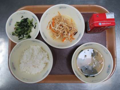 今日の給食は ごはん 牛乳 こぎつねちらし(具) だいこん葉のいためもの みそ汁 です。