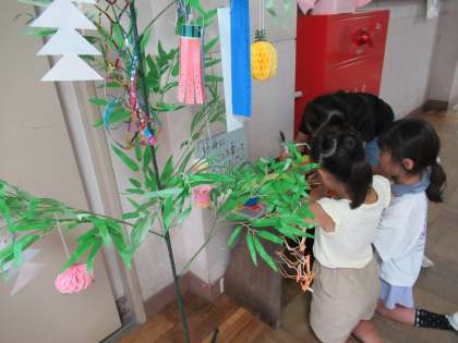 給食室前に七夕の笹の葉を飾りました。さっそく短冊に願い事を書いて、飾っている子がいました。