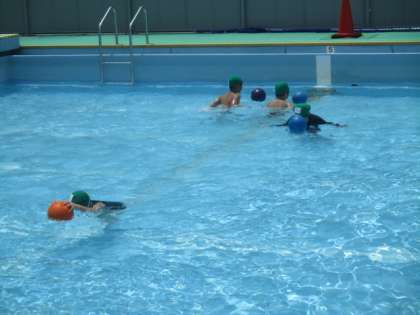 今日は、水中ドリブルやでんしゃごっこをしました。