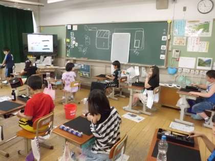 3年生になってはじめて,書写(毛筆)の学しゅうをしました。まず,道具のじゅんび,しせい,すみのすり方,筆の持ち方を知りました。じゅんびがととのった後,今回のめあての「横画」について学びました。横画を使ったかん字「一・二」を筆の動きに気をつけて書きました。筆の動きには「始筆・送筆・終筆」があることも知りました。みんな,はじめての毛筆の学しゅうに,気合いっぱい!とてもりっぱに書上げることができました。