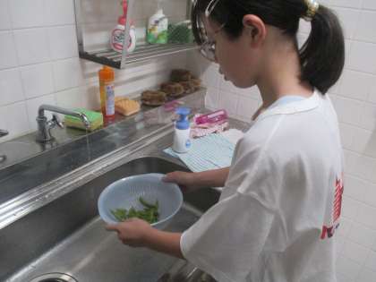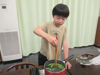 今日は皆で栽培した枝豆を塩茹でして食べました。一人一人が洗う・塩でもむ・茹でる・タイマーなどといった役割に分かれて活動することが出来ました。美味しく出来上がったのでよかったです。